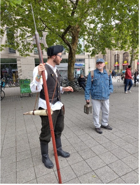 Après le voyage de nuit, Gabriela a invité à un brunch. Les invités ont pu y reprendre des forces et les premières rencontres ont eu lieu. Après un temps individuel, nous nous sommes à nouveau retrouvés à l'Entlas-Keller. Enfin, nous avons flâné dans Erlangen, avant de rencontrer le gardien de nuit qui a raconté en français son travail au Moyen-Âge, le petit village d'Erlangen au départ et les changements au fil du temps. Il n'y a pas eu de cache-cache. Nous avons été impliqués dans ses descriptions comme des personnages de théâtre.